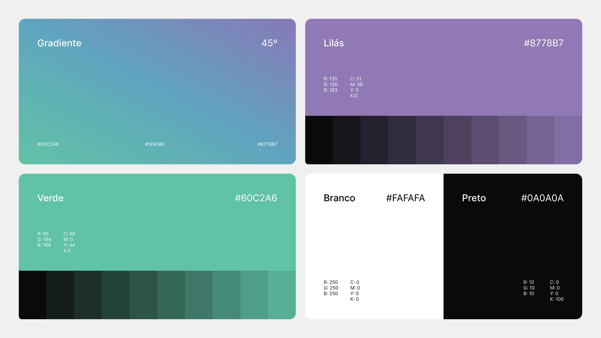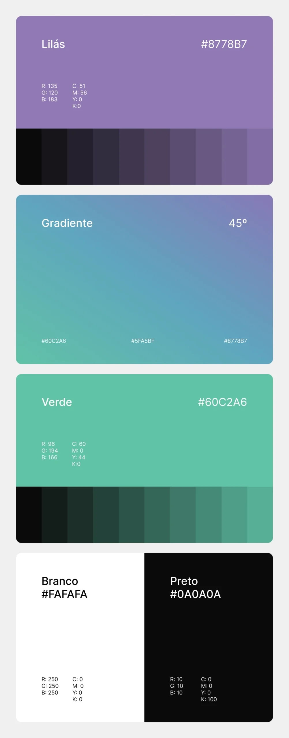 A paleta de cores tem o verde e o lilás como base, além disso, combinando estas duas cores produzimos um lindo gradiente, que dará um visual único para as aplicações.
