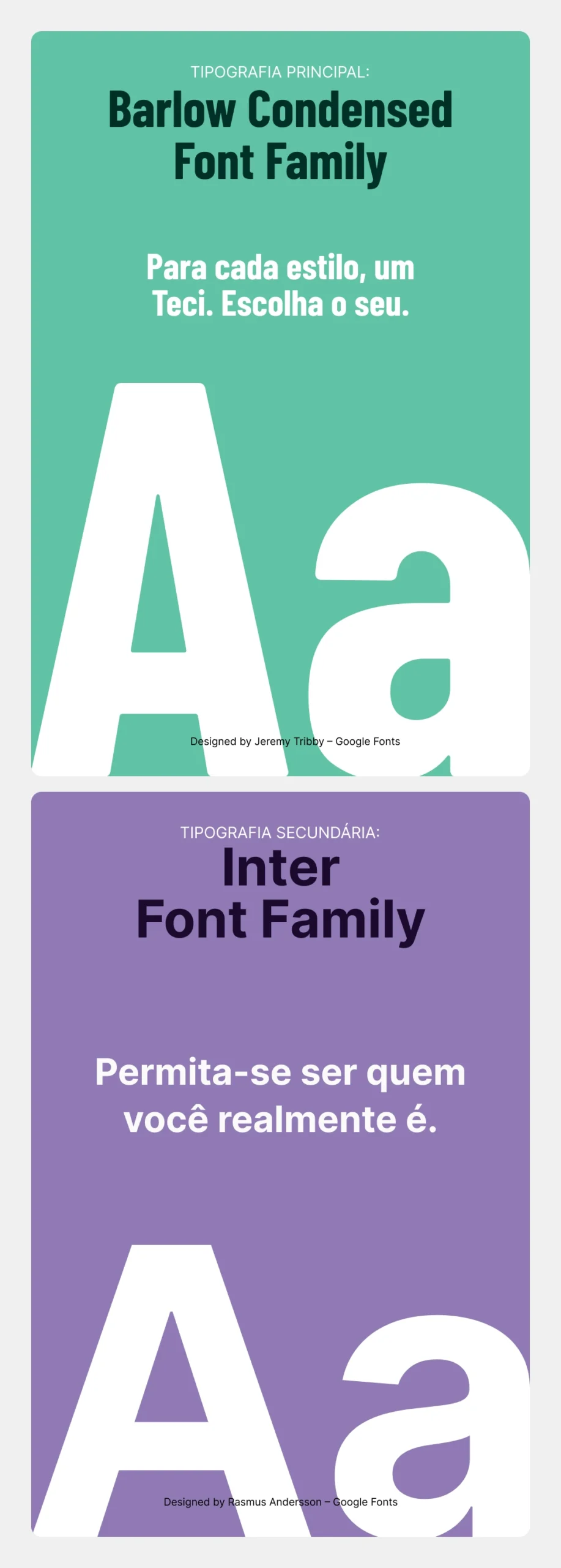 Na tipografia, contamos com duas famílias tipográficas: A Barlow Condensed Font Family e a Inter Font Family. Juntas, elas irão brilhar em todos os pontos de contato da marca.