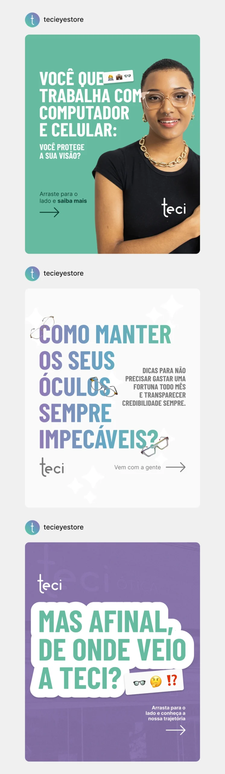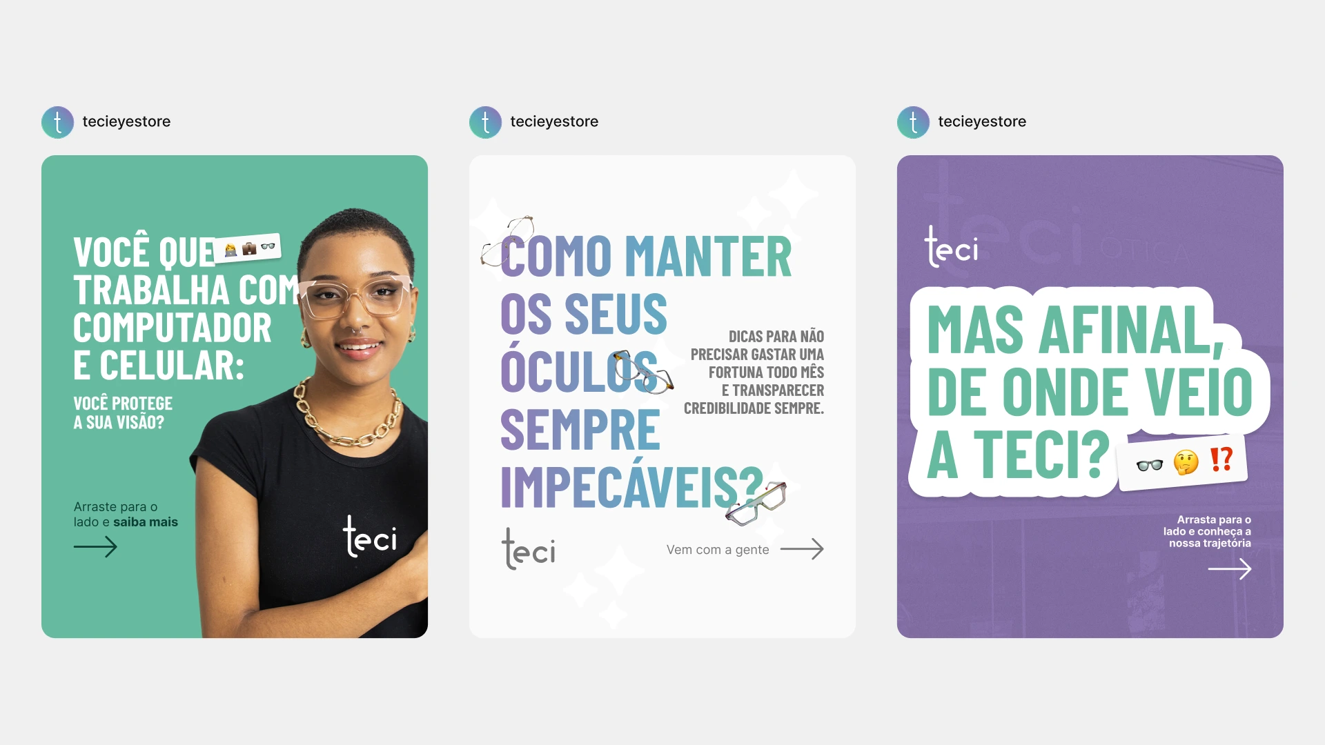 Pensando em manter a experiência Teci tanto para os clientes que visitam a loja física quanto para os que realizam a compra de forma online, pensamos em toda a experiência de unboxing, fazendo a caixa, os adesivos, os impressos e o estojo dos óculos, tudo personalizado e ressaltando todo o carinho que a marca tem com os seus clientes.
